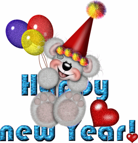 A cheerful grey teddy bear in a party hat holds colorful balloons, celebrating with 'Happy New Year!' text and a red heart.