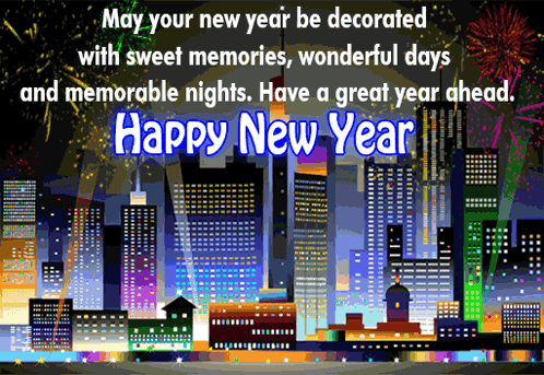 A vibrant New Year greeting featuring a dazzling cityscape, festive fireworks, and heartfelt wishes for sweet memories and wonderful days ahead.
