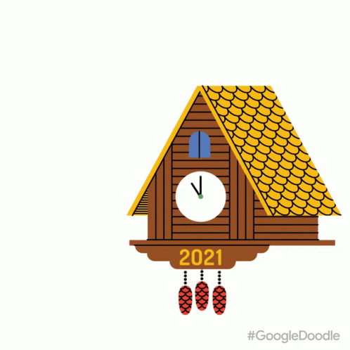 A festive Google Doodle cuckoo clock celebrates New Year's Day 2021 with a cheerful bird.