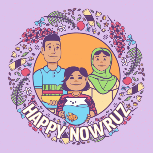 A vibrant cartoon illustration of a family celebrating Happy Nowruz, the Persian New Year.