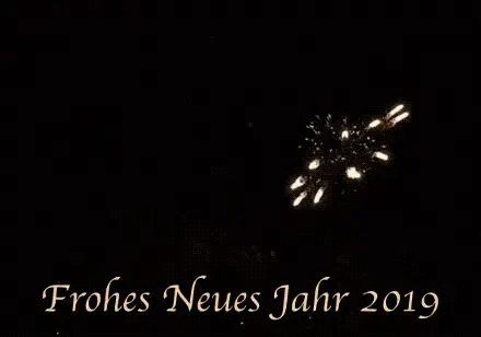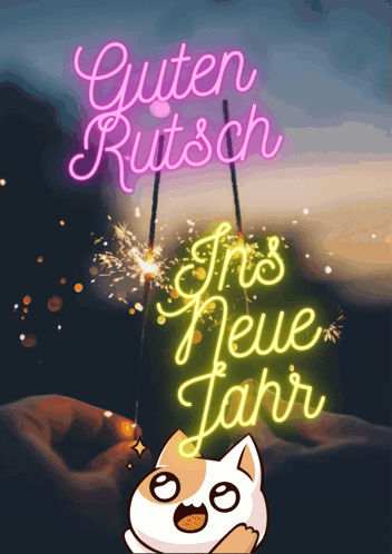 Neon signs glowing 'Guten Rutsch Ins Neue Jahr' (Happy New Year) with sparklers and a cute cat emoji.