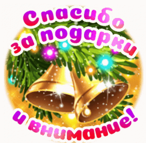 Animated New Year's greeting sticker with bells and lights, saying 'Thank you for the gifts and attention' in Russian.