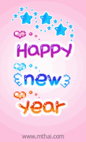 A vibrant animated greeting wishing 'Happy New Year', adorned with sparkling stars, hearts, and wings on a pink background.