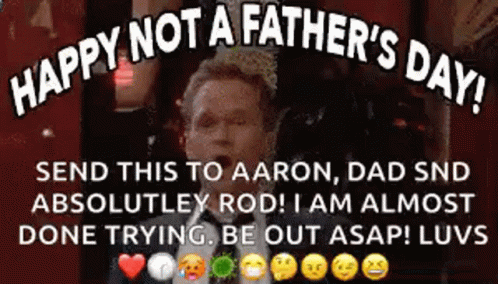 Barney Stinson from How I Met Your Mother celebrates "Happy Not A Father's Day" with a message to Aaron, Dad, and Rod.