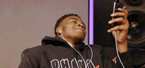 Not3s smiling and looking delighted while reading a message on his phone, wearing earphones.