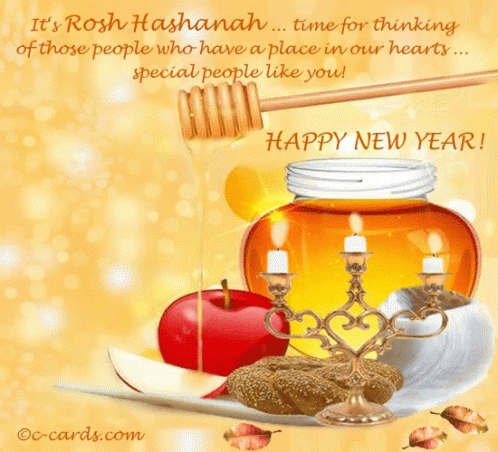 A festive animated greeting card wishing a Happy Rosh Hashanah and a Happy New Year, featuring traditional symbols.