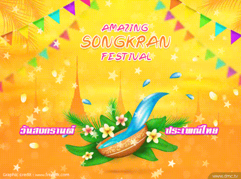 Vibrant animation celebrating the Amazing Songkran Festival with traditional water bowl, flowers, and flags.