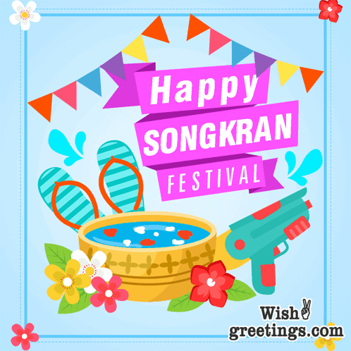 Vibrant greeting card for Happy Songkran Festival, featuring water gun, bowl, flip-flops, and flowers.