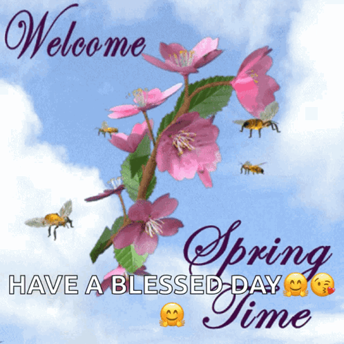 Welcome to Spring Time with beautiful pink flowers, buzzing bees, and a blessed day message.
