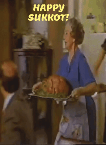 Marion Ross and others celebrate Sukkot, a Jewish holiday, at a dinner table, with "Happy Sukkot!" and "Hello Gorgeous!" captions.