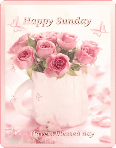 A beautiful greeting card wishing a Happy Sunday, featuring pink roses in a white mug and delicate butterflies.