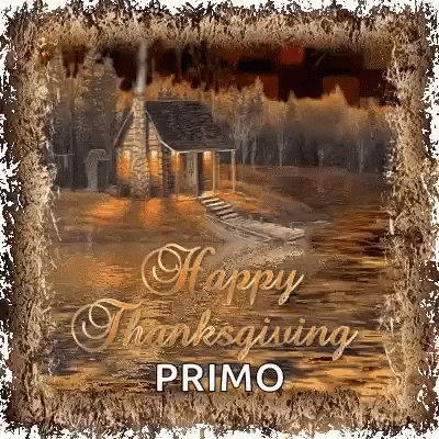A warm Happy Thanksgiving greeting card featuring a rustic cabin by a lake with a small boat.