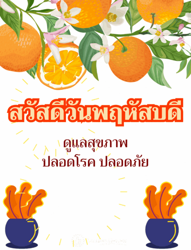 A vibrant Thai greeting card for Happy Thursday, featuring oranges and flowers, wishing good health and safety.