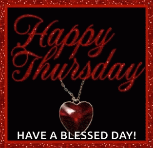 A sparkling animated greeting card wishing a Happy Thursday and a blessed day, featuring a red heart pendant.