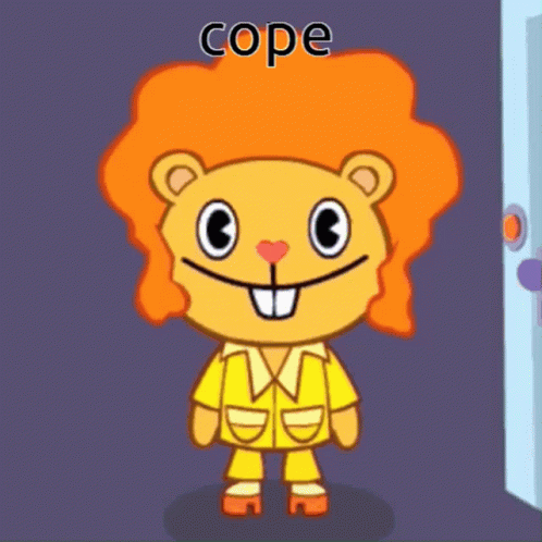Disco Bear from Happy Tree Friends stands with 'cope' text, showing a happy expression in his disco outfit.