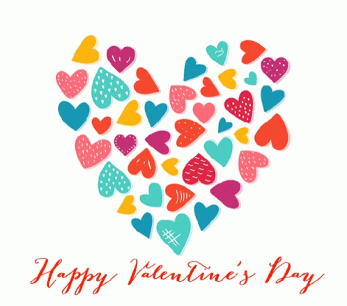 A vibrant Happy Valentine's Day card featuring a large heart composed of many colorful smaller hearts.
