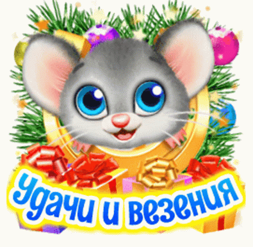 A cute cartoon mouse with big blue eyes wishes 'Happy New Year 2020' with gifts, horseshoes, and festive decorations.
