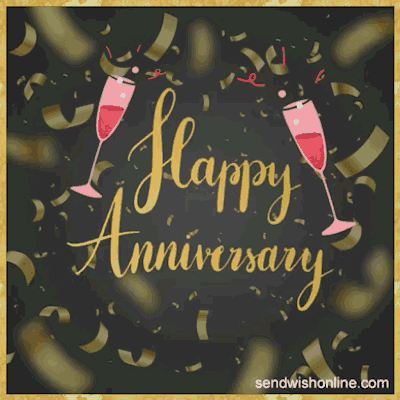 A festive animated card wishing a happy anniversary, featuring champagne glasses and golden confetti.