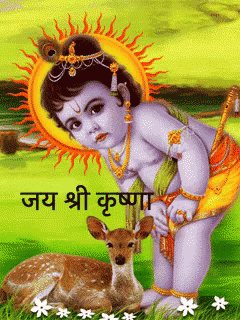 Baby Krishna with a deer, celebrating Happy Janmashtami and Jai Shree Krishna.