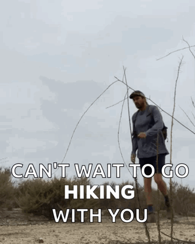 Happysunnylight Excusemeety hiking in a desert landscape, expressing excitement to hike with you.