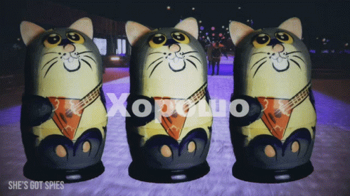 Three Russian nesting dolls, designed as cats playing balalaikas, dance with the word "Хорошо" (Good) displayed.
