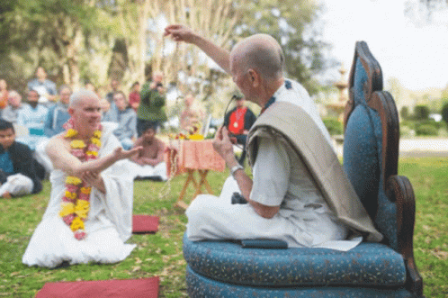 Two men in white robes participate in a Hare Krishna Iskcon initiation ceremony outdoors.