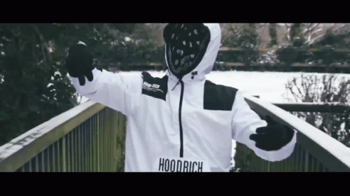 A masked Harlem drill artist in a white Hoodrich jacket performs in a snowy urban environment.