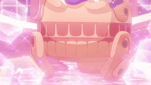 A cute anime girl, Yachiyo, is lovingly carried by a large robot in a scene from Harmy Harmageddon.