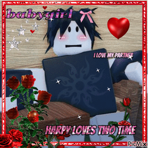 Roblox character Harpy expresses love for Two Time with roses, hearts, and glitter effects.
