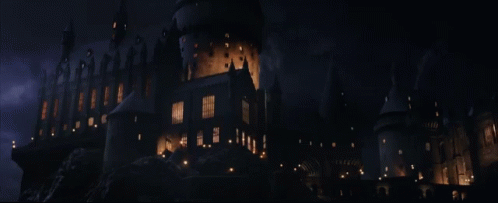 Hogwarts Castle from Harry Potter illuminated at night with many lights.