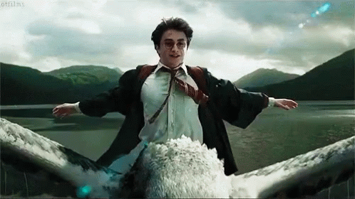 Harry Potter (Daniel Radcliffe) flying with arms outstretched over a scenic lake and mountains.