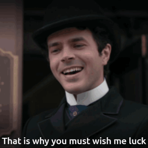 Harry Richardson as Larry Russell from HBO's The Gilded Age, smiling and asking for good luck.