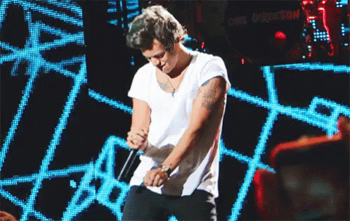 Harry Styles energetically dancing and performing on stage during a concert, wearing a white t-shirt.