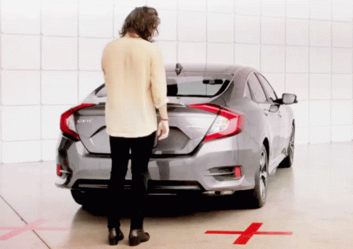 Harry Styles smiling and posing playfully with a gray car, looking handsome in a studio setting.
