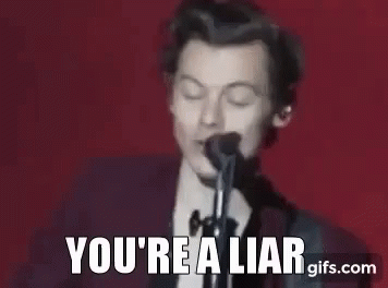 Harry Styles sings into a microphone on a red background, with the text 'YOU'RE A LIAR' displayed.