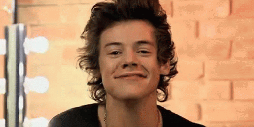 Harry Styles flashes an adorable smile, looking directly at the camera with his signature curly hair.
