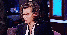 Harry Styles makes a confused or surprised face while sitting in a suit during an interview or show.