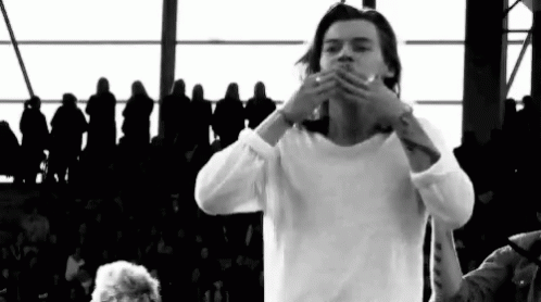 Harry Styles on stage, blowing a kiss to the audience during a concert, in a black and white video.