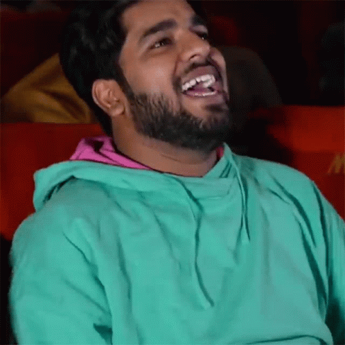 Yogesh Kathuria laughing heartily in a green hoodie at a theater, a truly funny and joyful moment.