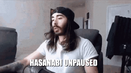 Hasan Piker reacts with excitement and relief to 'Hasanabi Unpaused' on screen.