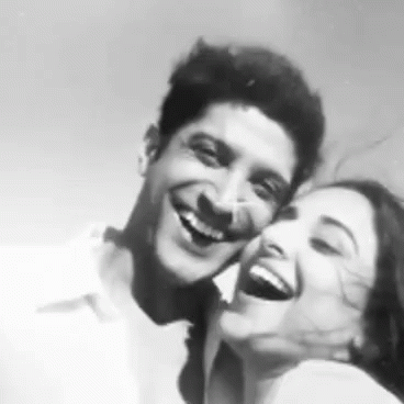 Farhan Akhtar and a woman share a funny, hilarious moment, laughing joyfully in this black and white clip.