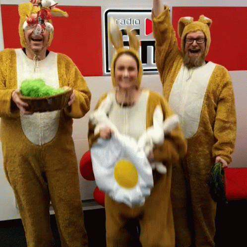 Axel Einemann, Dany Füg, and Frank Schambor in bunny costumes celebrate Easter at radio ffn.