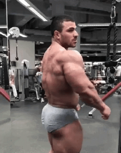 Hassan Mostafa, a highly muscular bodybuilder, poses in a gym, showcasing his impressive physique.