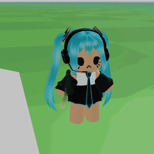 a girl with blue hair is wearing headphones and holding a green onion