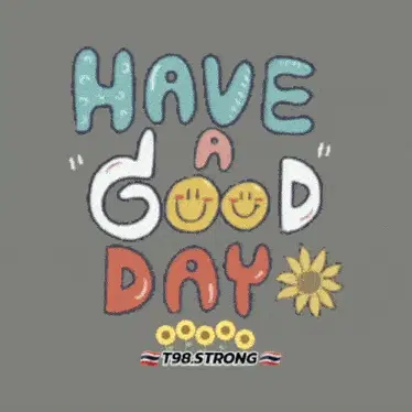 A cheerful sunflower wearing sunglasses in a field, with the message 'Have a Good Day' and 'T98.STRONG'.