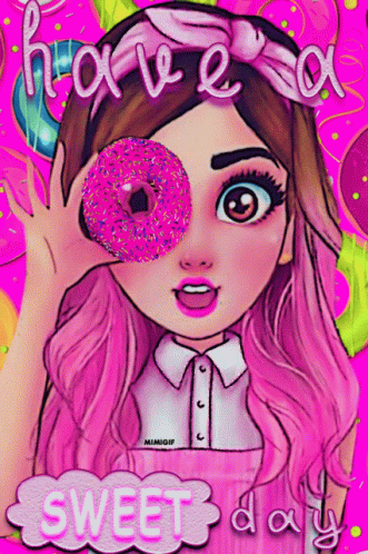 A cartoon girl with pink hair holds a donut over her eye, wishing you to Have A Sweet Day.