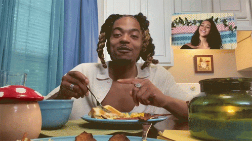Young Rog, smiling, offers a bite of his breakfast during a video call, showing scrambled eggs on a fork.