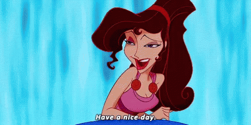 Megara from Disney's Hercules delivers a sarcastic 'Have a nice day' with a smirk.