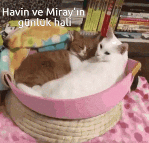 Havin and Miray, two cats, adorably yawn together while cuddling in a pink basket.
