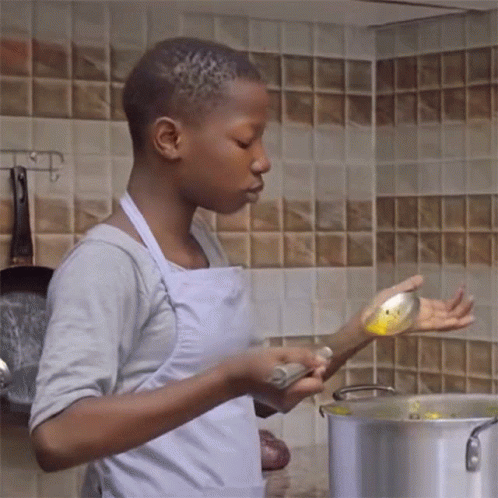 Emanuella, wearing an apron, tastes food from a large pot while cooking in a kitchen.